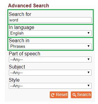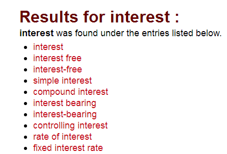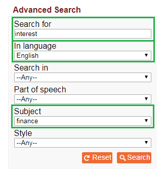 To find every example of the word ‘interest’ that includes the domain ‘FINANCE’ in the English-language content of the dictionary: put the word ‘interest’ in the search box, select ‘ENGLISH’ in the language box, and select ‘FINANCE’ in the Domain box.