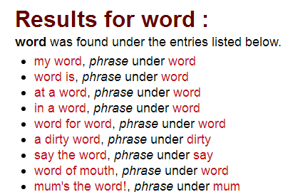 To find every example of the word ‘word’ as part of a phrase in the English-language content of the dictionary: put ‘word’ in the search box, choose ‘ENGLISH’ in the language box, and choose ‘PHRASES’ in the box ‘SEARCH IN’.