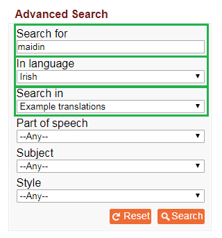 To find every example of the word ‘maidin’ as part of a sampla sentence in the Irish-language content in the dictionary: put ‘maidin’ in the search box, choose ‘IRISH’ in the language box, and choose ‘EXAMPLE TRANSLATIONS’ in the box ‘SEARCH IN’.