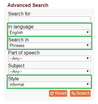 To find every phrase that includes the style marker ‘INFORMAL’ in the English-language content of the dictionary: leave the search box empty, choose ‘ENGLISH’ in the language box, choose ‘PHRASES’ in the ‘SEARCH IN’ box and choose ‘INFORMAL’ in the style box.