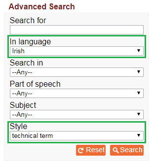 To find every Irish translation with the style marker ‘TECHNICAL TERM’ in the Irish-language content of the dictionary: leave the search box empty, choose ‘IRISH’ in the language box, and choose ‘TECHNICAL TERM’ in the style box.