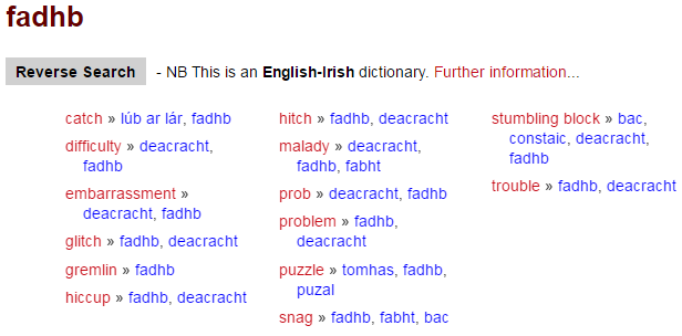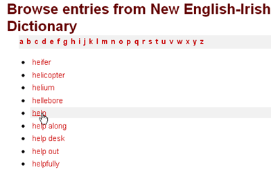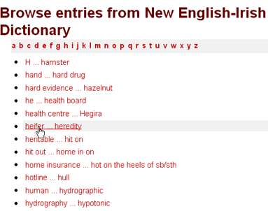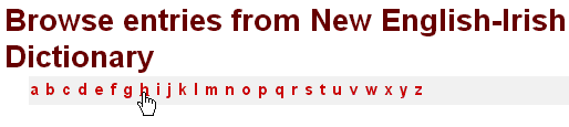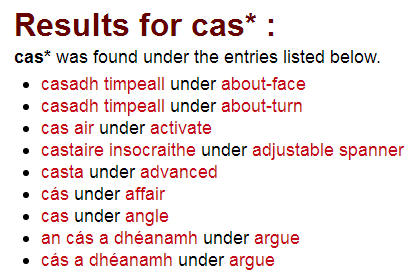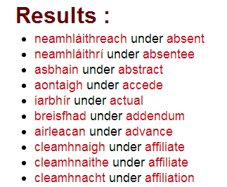 when you search for an Irish word, the browse index won’t display a list of adjacent Irish words; once again this is an English-Irish dictionary, and the indexes are based accordingly on the English headwords.