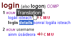 You now decide you’d like some more information about the Irish translation for details, which appears as part of the entry displayed above. Simply double-click on the word details, and then click once on the ‘Translation’ label which now appears above it: