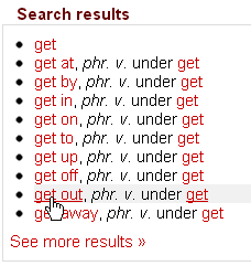 When you look up any word in the dictionary, the Search Results panel on the right-hand side shows all phrasal verbs, phrases and compound headwords which contain your search string. So if, for example, you’ve looked up get, which is one of the longest entries in the dictionary, you’ll see the following: