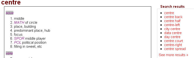 You can also use the Search Panel to select a completely different headword if you wish. For example, if you search for centre you’ll see the following: