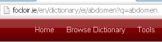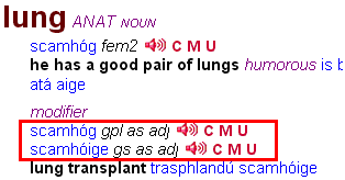 Click on the part-of-speech tag which appears immediately after the Irish translation. For example, if you’ve looked up black, and you want to see the grammatical information for the Irish translation dubh, you would click on the tag ‘adj1’ beside it.