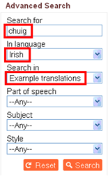 (Note that there are also several examples of the word ‘chúig’ shown in the results above – this is because the Advanced Search looks for matches regardless of the fada).