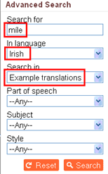 Suppose you’re not sure whether a particular number is followed by the singular or plural form of the noun – for example, let’s say you want to say ‘there were a thousand of them’, and you’re not sure whether you should say ‘mÃle ceann’ or ‘mÃle cinn’. Once again enter the three necessary parameters in the Advanced Search screen: