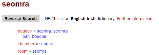 when you search for an Irish word, results are displayed in alphabetical order by English headword, and very often the most important or common meaning of the Irish word isn’t at the top of the list. For example, if you search for ‘seomra’: