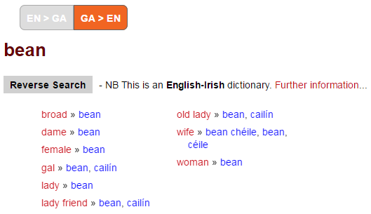 You can click on option ‘GA>EN’ above to search for ‘bean’ in Irish rather than in English: