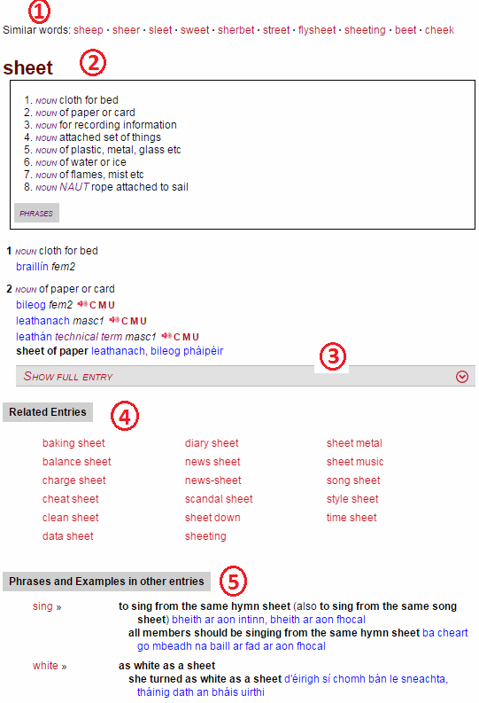 We’ve made a significant change to the basic search, in order to give you the best possible results, and also to be consistent with the search function on www.teanglann.ie. Previously, when you searched for a word the matching entry was displayed; with the new version of the search, you’ll see a lot of additional data as well. For example, if you search for the word sheet you’ll get the following results: